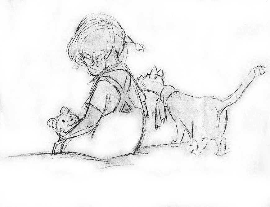 Прорисовать в руках малыша контур тела собачки. При этом важно не давить на карандаш.