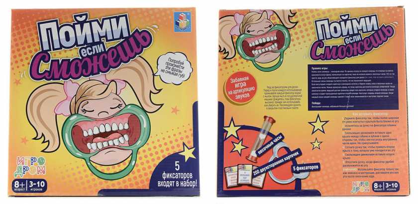 Развиваем артикуляцию и речь со смешным загубником во рту, прочитывая оригинальные фразы («Колибри облюбовали библиотеку для бодибилдинга») так, чтобы остальные игроки сумели вас понять.