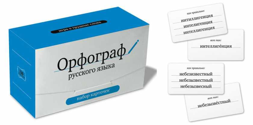 Хотите проверить себя и вашего школьника на правильность написания слов? Игра представляет собой набор из 120 карточек, на лицевой стороне которых приведены три варианта написания трудного слова (интеллигенция, небезызвестный, априори). Из них только один правильный. Задача игрока — определить его и, перевернув карточку, проверить себя или другого участника игры.
