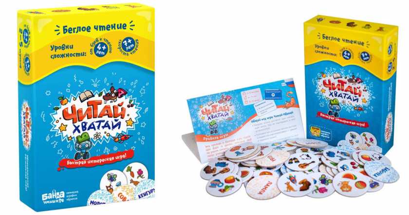 Самый весёлый и эффективный способ развить скорочтение. В игре три варианта правил разной сложности и два набора жетонов со словами разной длины (3–5 букв и 6–7 букв). Игроки наперегонки стараются как можно быстрее сопоставить слово с картинкой и собрать максимальное количество жетонов.
