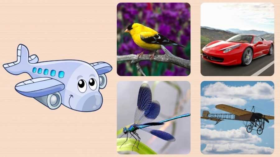 А самолет? — на птицу, машину, стрекозу, аэроплан;