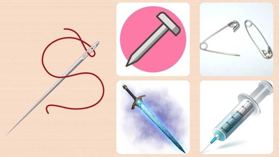 Швейная игла? — на гвоздь, шприц, булавку, клинок, стержень, хвоинку, шип, кнопку;