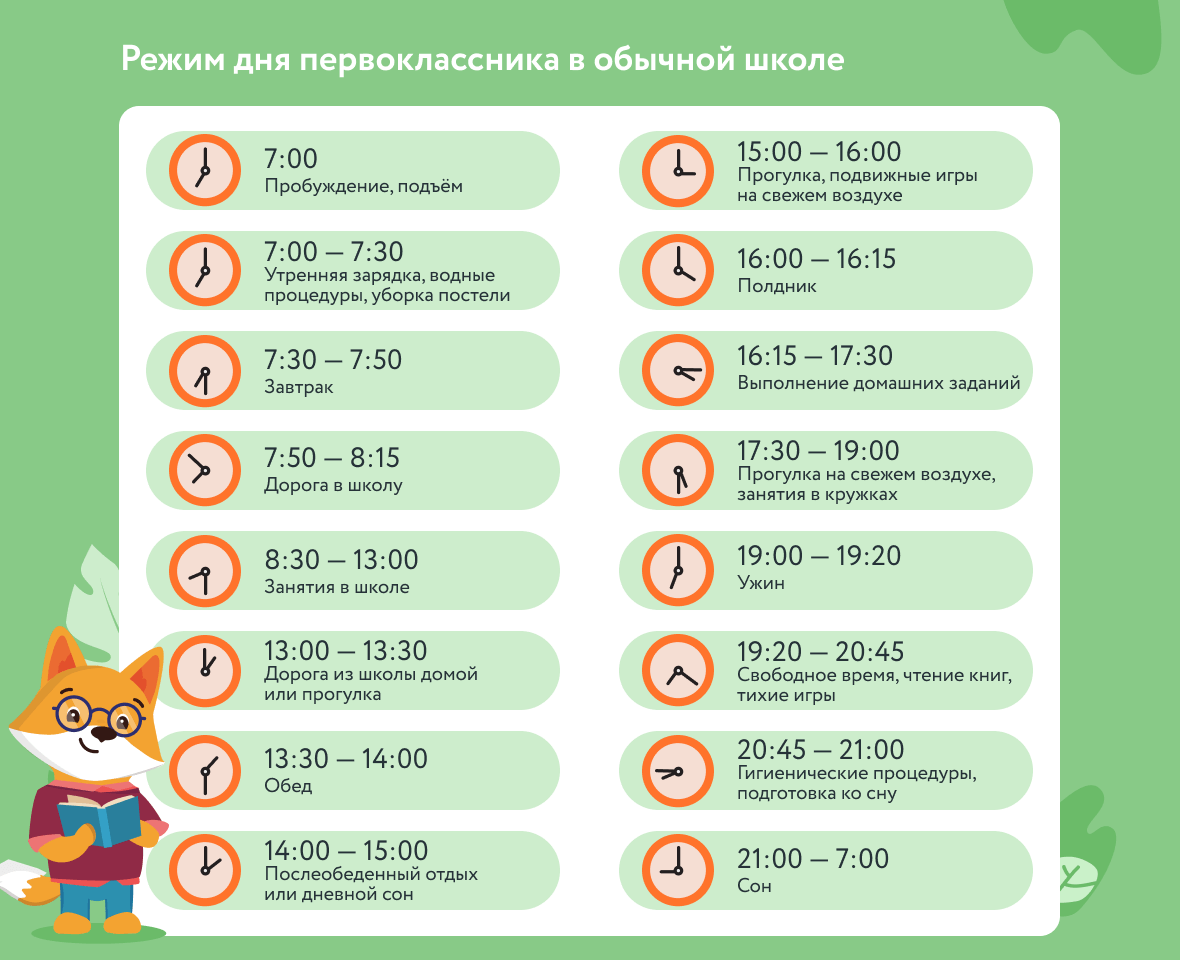 Шаблонный распорядок дня для учащегося 1 класса скорее всего предложит учитель на первом же родительском собрании. В этот план останется включить индивидуальные особенности графика:
