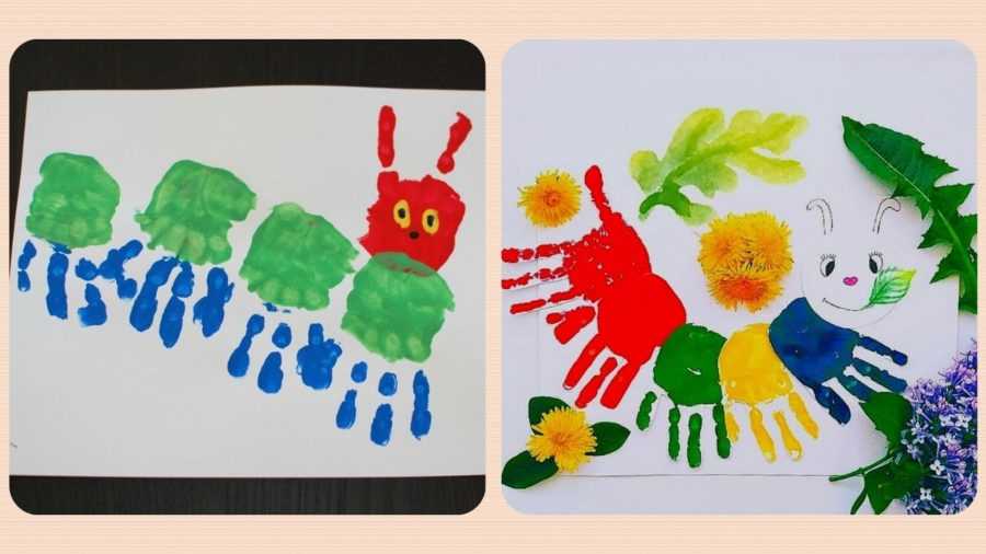 Ребенок обмазывает ладонь зеленой краской. Первый отпечаток он ставит на горизонтально направленном листе, затем еще три на перевернутом вверх тормашками. Далее нужно перевернуть бумагу обратно, после высыхания изображения подрисовать на первом отпечатке глаза и ротик, на следующих — ботиночки на лапках.