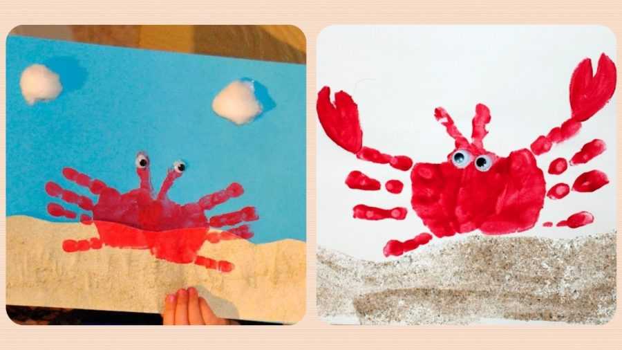 Педагог помогает воспитаннику нанести на обе ладони красную краску. Затем ребенок соединяет запястья, а растопыренные пальцы разворачивает в разные стороны, насколько это возможно анатомически. В таком положении прижимает руки к бумажному листу. Остается изобразить черные глазки внутри отпечатков больших пальцев и зеленые водоросли вокруг краба.