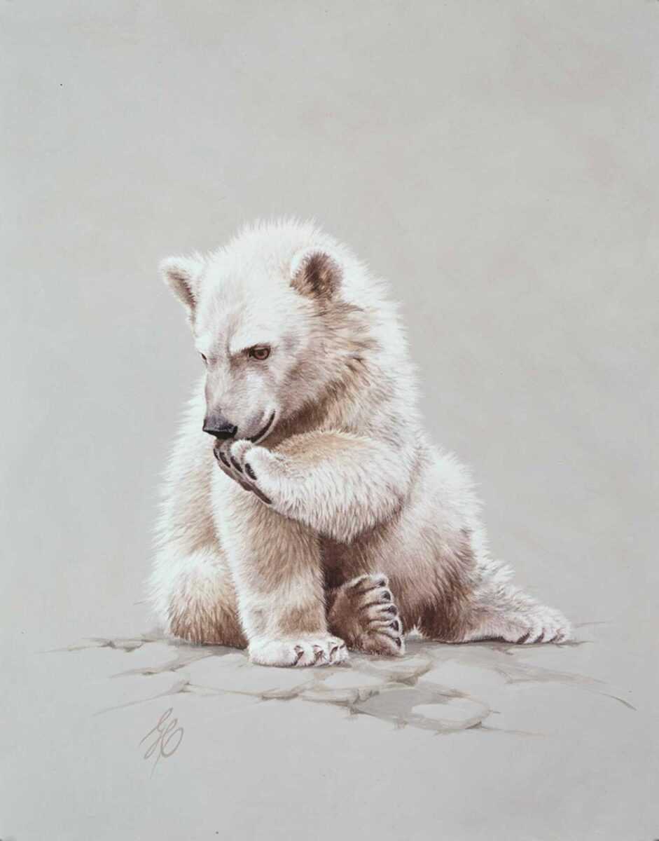 Если вы разобрались с предыдущими рисунками, давайте нарисуем белого медведя, который является обитателем Арктики и Северного полюса. Белого медведя видели и в знаменитом мультфильме «Умка». Поскольку в этих регионах очень холодно, нарисуем медвежонка в шапке и свитере. Рисуем белым карандашом на синем фоне и раскрашиваем красками. Как нарисовать белого медведя: