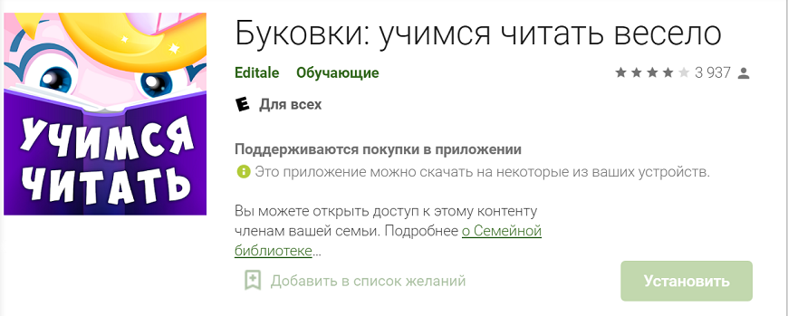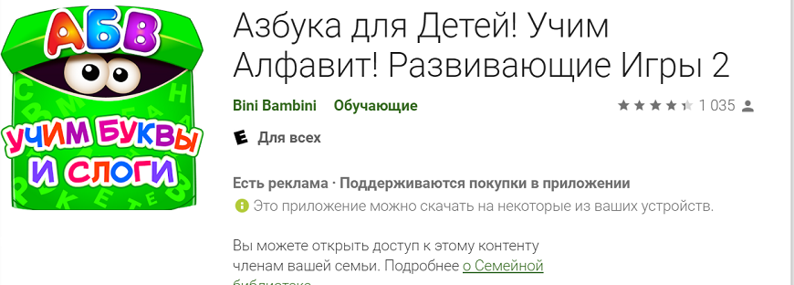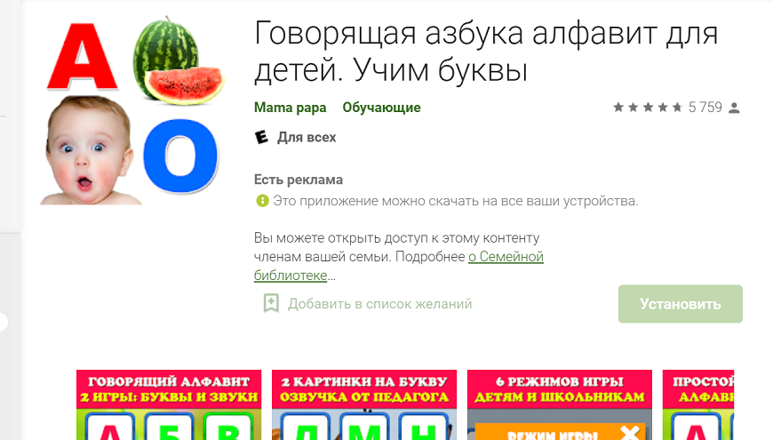Все буквы алфавита ребенок учит по ярким картинкам. Интерфейс приложения простой, доступный, есть звуковое сопровождение. Обучение происходит не только через картинки, но и с помощью загадок. Приложение бесплатное.