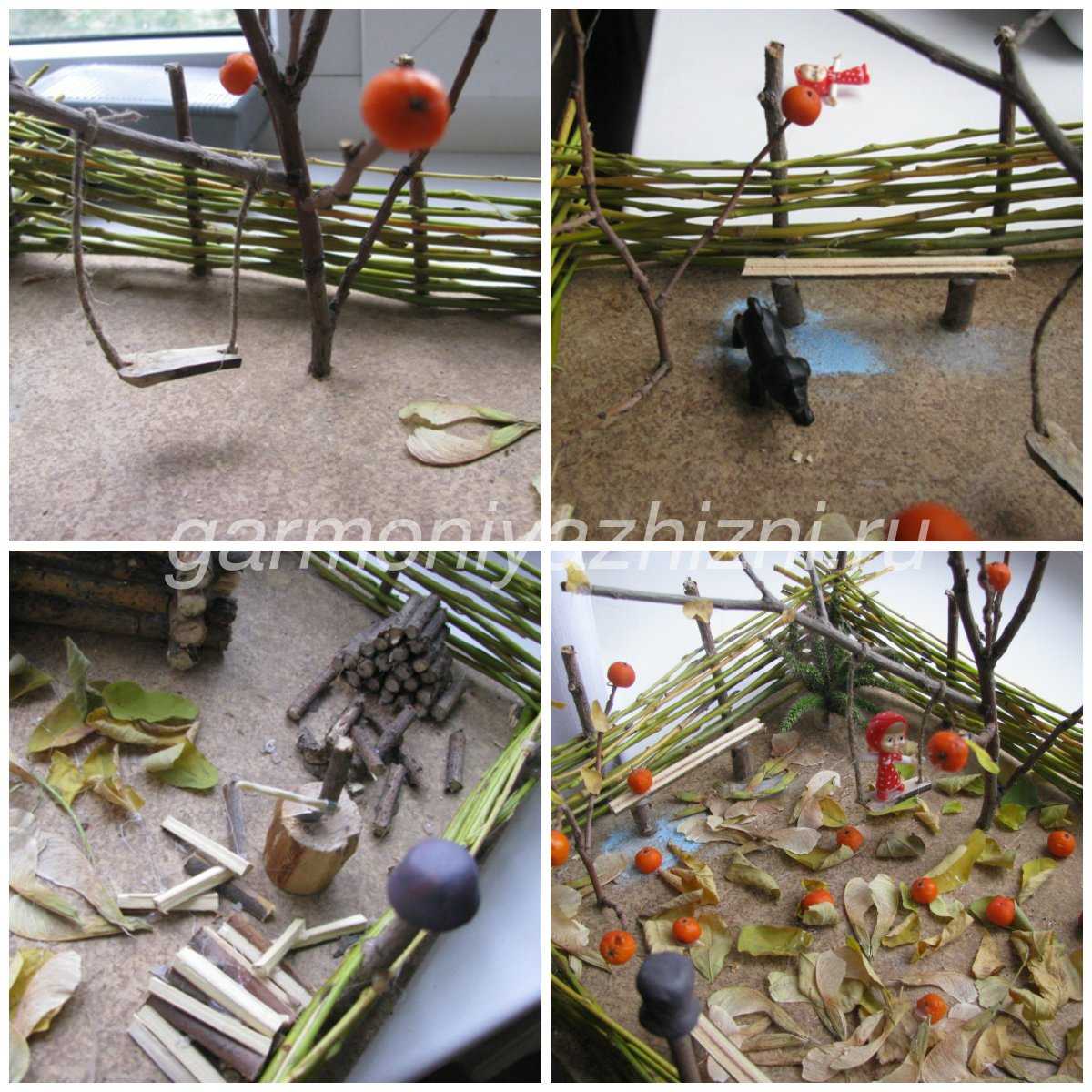 Ещё я посадила кустики из травы похожей на колоски, не знаю как она называется, на плетень слепили из пластилина и повесили что-то вроде глиняных горшков.