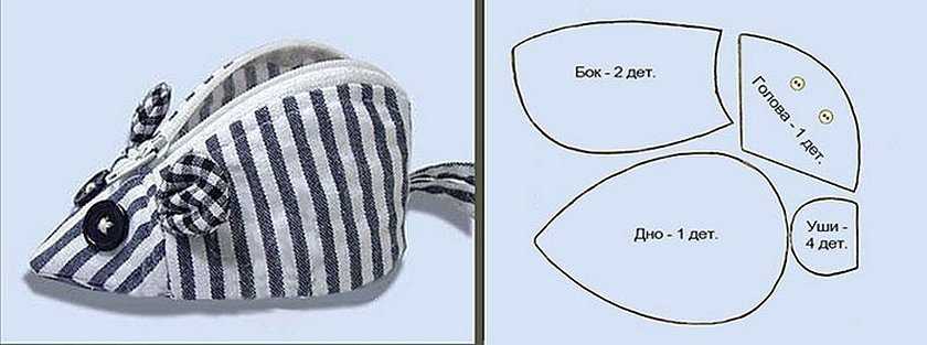 После того, как нужный шаблон будет подобран, определиться с тем, как сделать мышку из ткани в любой интерпретации становится более понятно. В процессе работы стоит проявлять усердие и аккуратность – тогда точно получится красивое изделие с яркими акцентами в виде отделки. Для маленькой девочки можно пошить косметичку в виде веселой мышки. Такое изделие может стать и пеналом для карандашей, хранилищем для украшений. Вариант изготовления косметички с эскизом для формирования выкройки представлен на картинке 3.