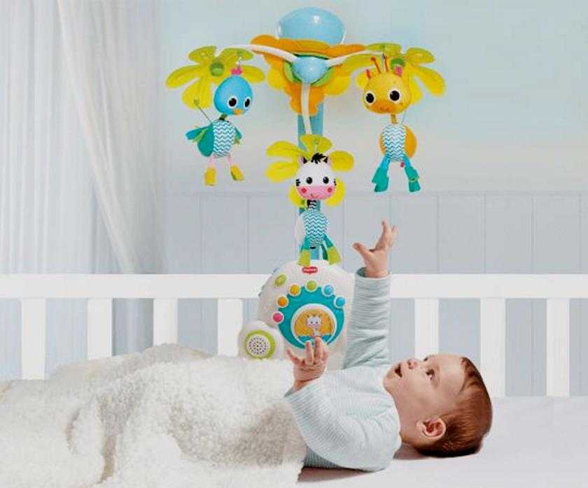 Мобиль tiny love – это устройство как карусель, на которой прикреплены несколько игрушек, вращающихся под музыку. Производство игрушки – Израиль, собирается она в Китае. Хотя это никак не влияет на ее качество.