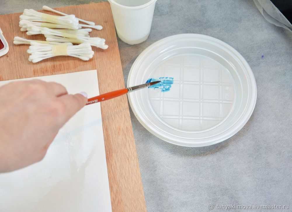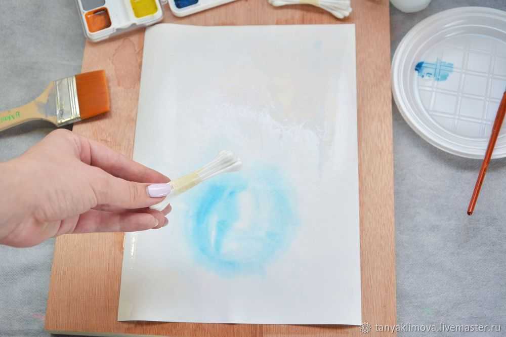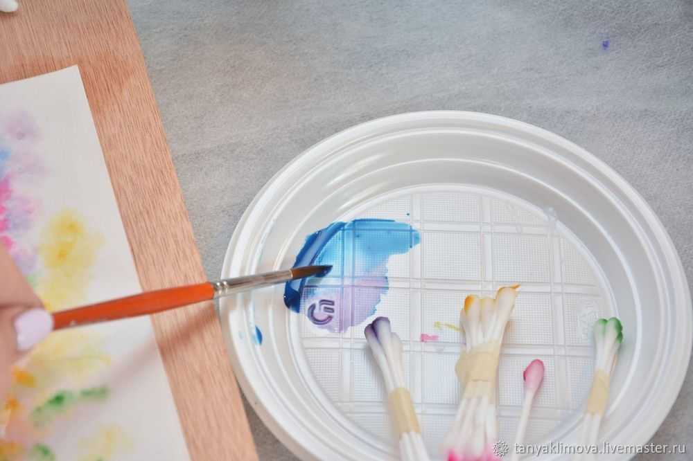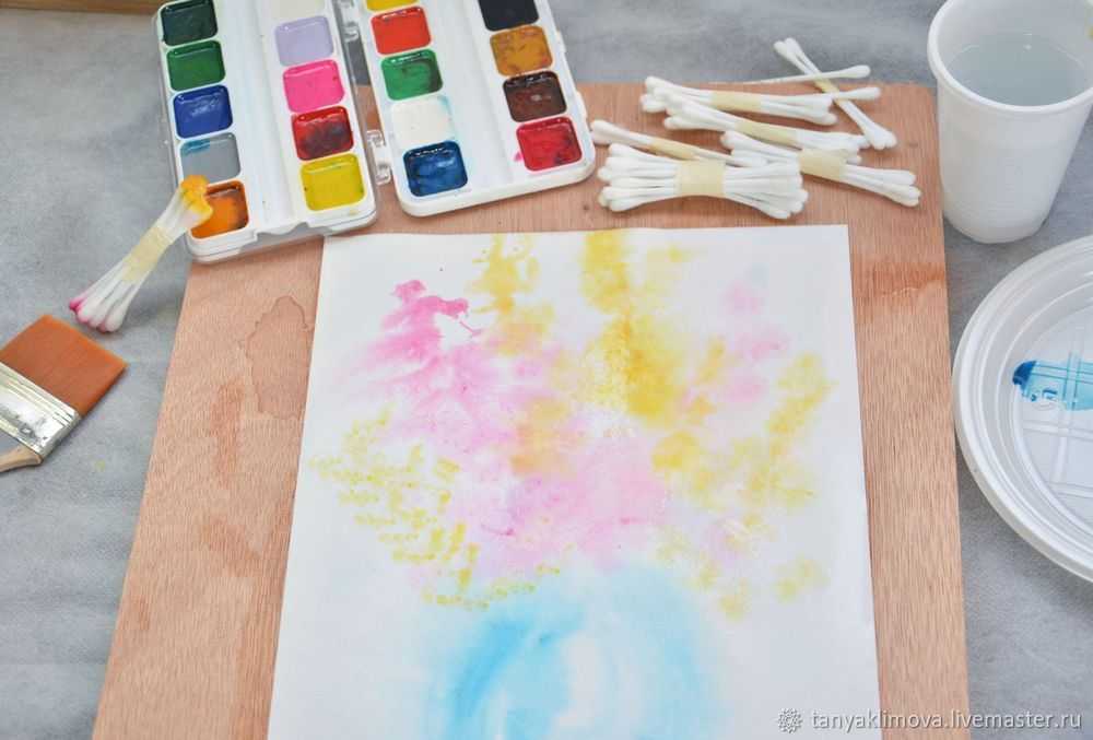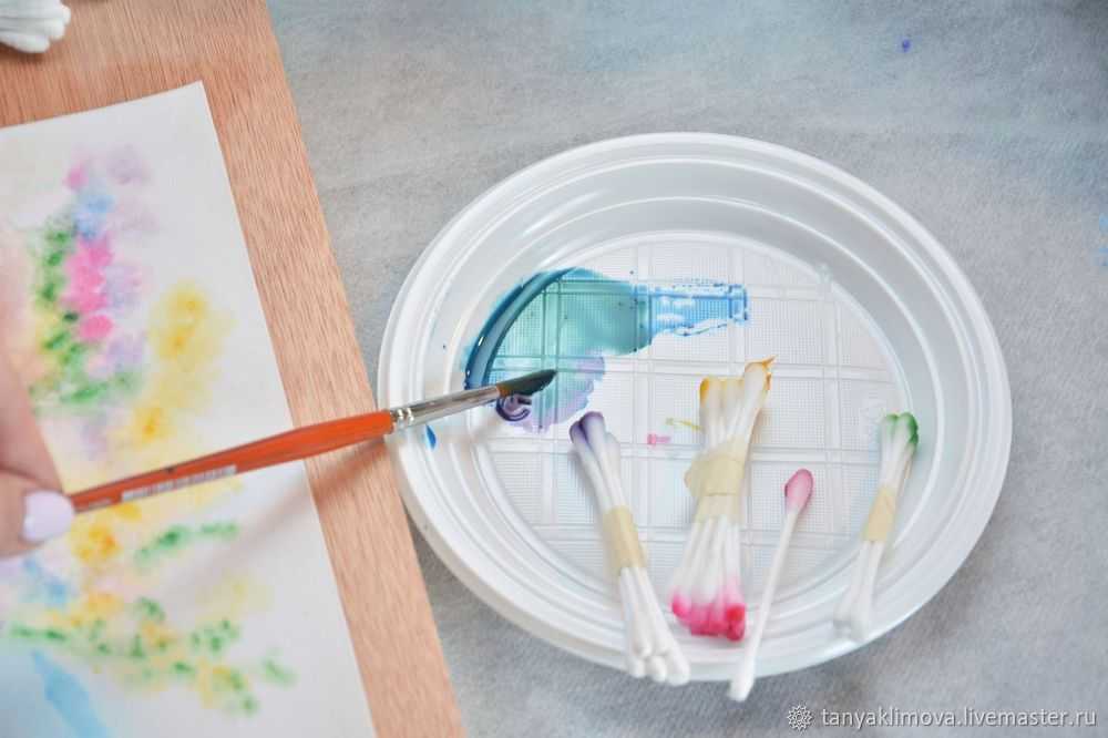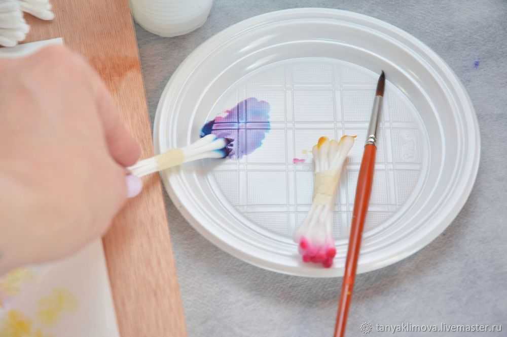 А чтоб было еще интереснее, добавим в работу пучки ватных палочек.