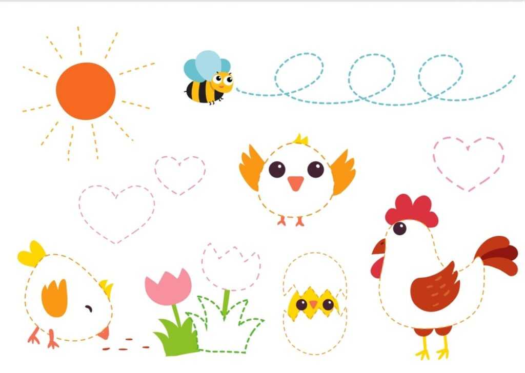 В этих простых занятиях по соединению кроется настоящее «волшебство» – из непонятных закорючек вдруг появляется рисунок. Подходят раскраски ребятам от 4-5 лет. Для совсем маленьких – задания с пунктирными линиями, для детей постарше – точки с цифрами. Первый раз упражнение следует выполнить вместе с ребенком – взрослый должен показать очередность движений.