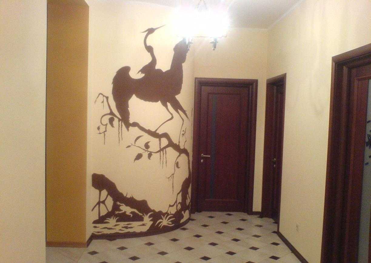 Начинать роспись стены своими руками нужно с широкой кисти и светлых оттенков, постепенно переходя к темным цветам и тонким линиям. В процессе работы необходимо иногда отходить от стены и оценивать рисунок с расстояния.