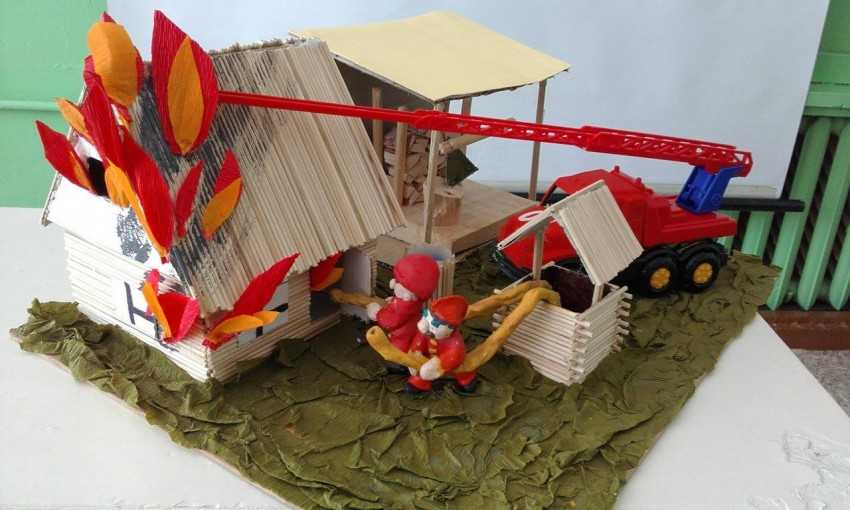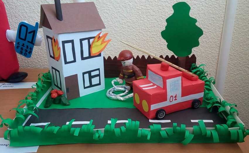 Например, пожарная машина из картонной коробки, пожарные из пластилина или теста, а дом можно сделать из прутьев, спичек и другого материала.