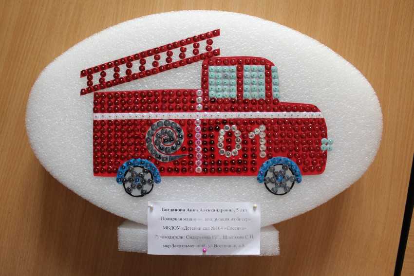 Из коробок можно сделать пожарную машину. Школьники могут делать поделки из бисера или лоскутов, создавая сложные композиции и красивые панно. Самой простой объемной поделкой является костер.