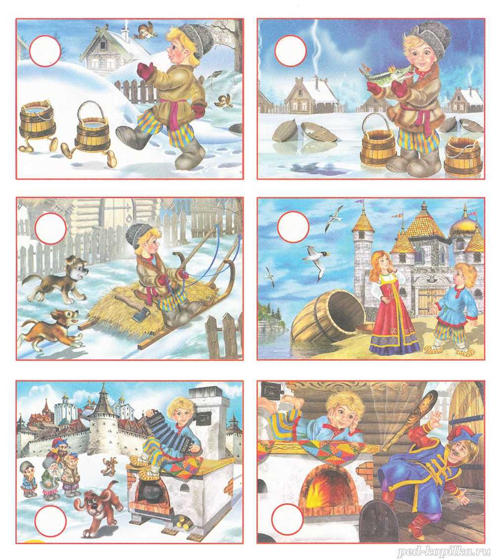 Подпиши номера иллюстраций к сказке «По щучьему веленью» в правильном порядке