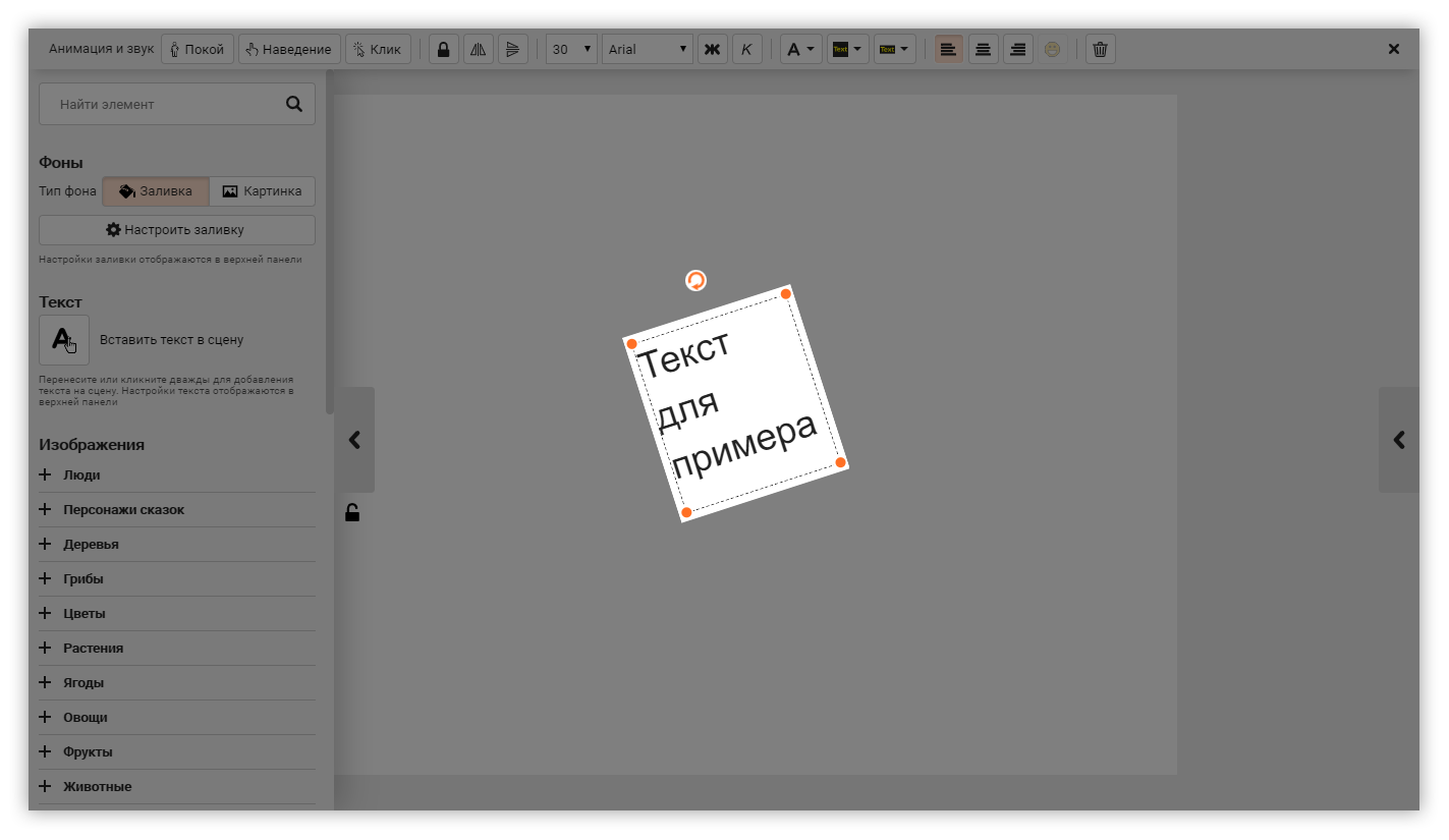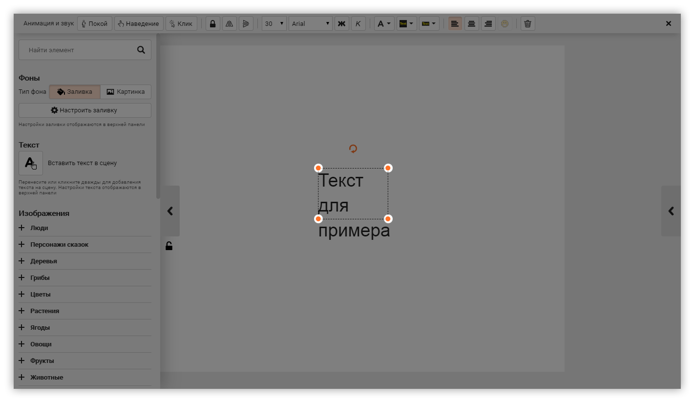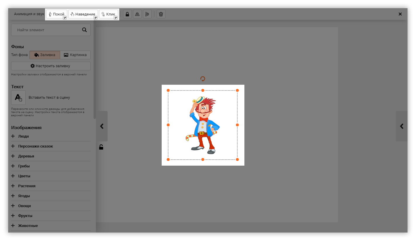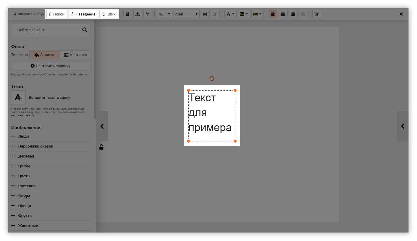 Кликните один раз на текст. На верхней панели найдите три кнопки: Покой, Наведение и Клик. Нажмите на нужную: откроется окно с выбором анимации и звуковых эффектов.