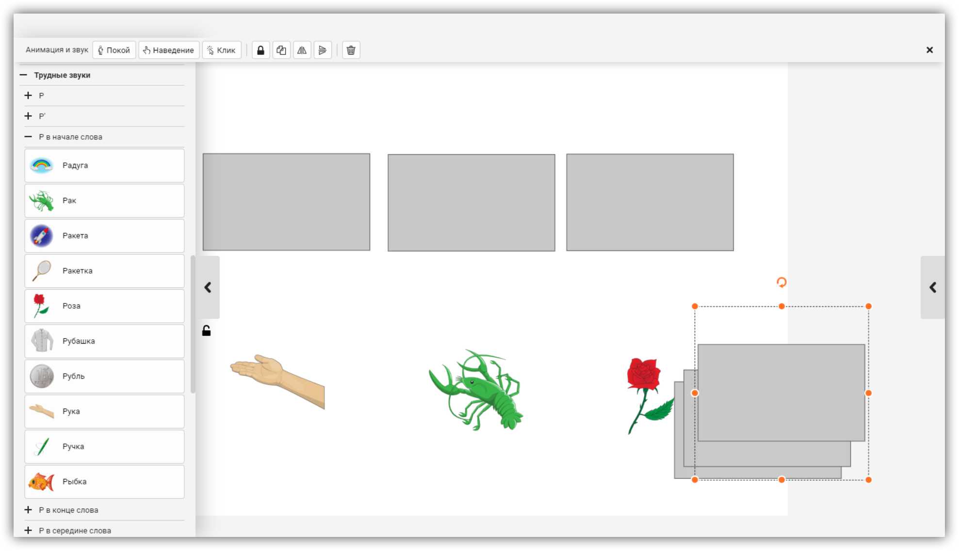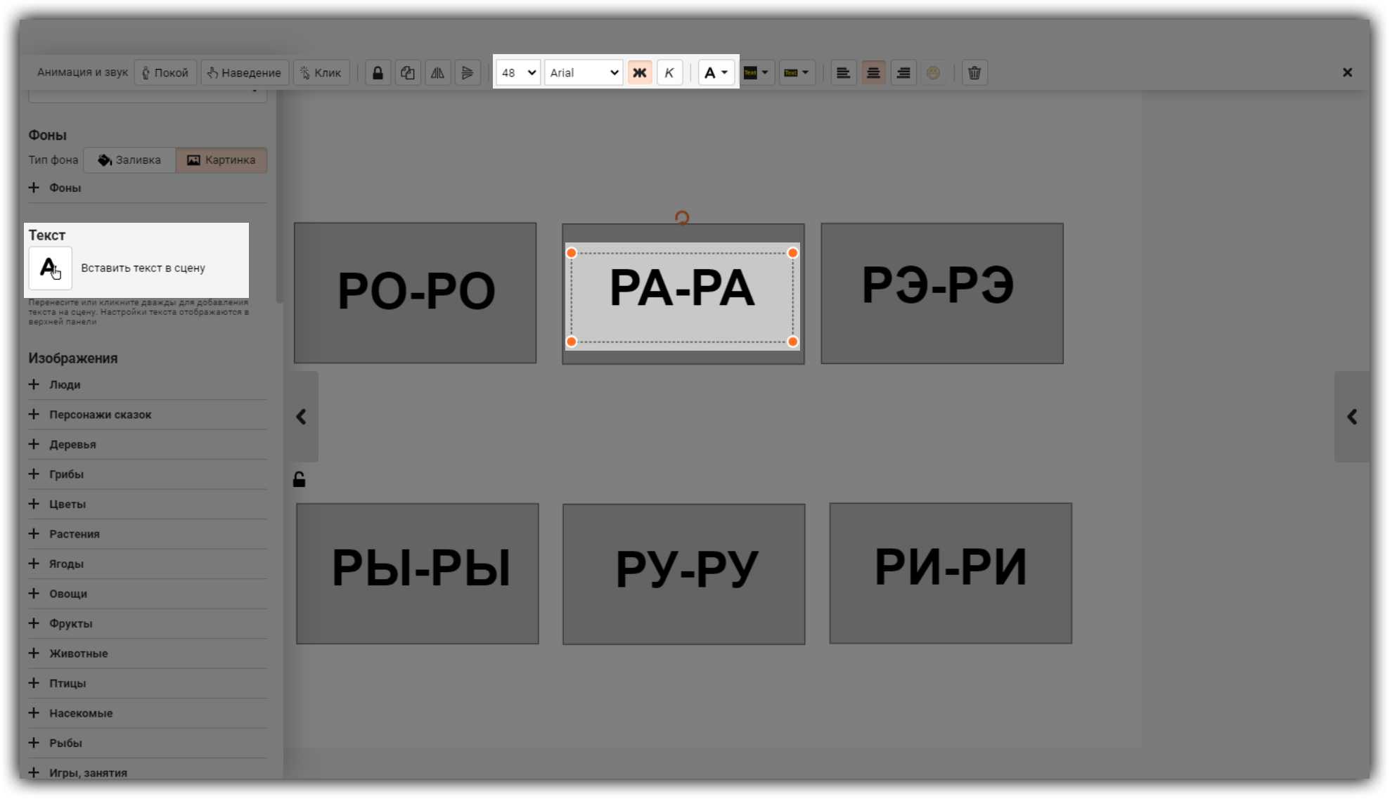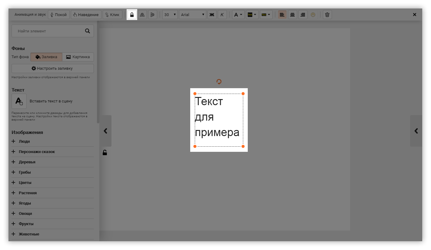 Кликните один раз на текст. На верхней панели найдите три кнопки: Покой, Наведение и Клик. Нажмите на нужную: откроется окно с выбором анимации и звуковых эффектов.
