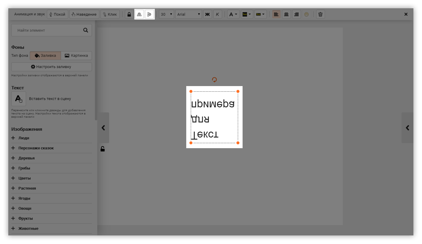 Кликните один раз на текст. На верхней панели нажмите на значки «Перевернуть объект по горизонтали» и аналогичный — по вертикали.