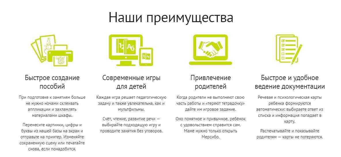 Портал Мерсибо придет на помощь воспитателям детского сада, педагогам, работающим с детьми дошкольного возраста. Материалы ресурса сэкономят время и силы педагога, дадут толчок к творческому подходу в формировании необходимых ребенку навыков и умений. Можно сформулировать следующие преимущества использования портала Мерсибо: