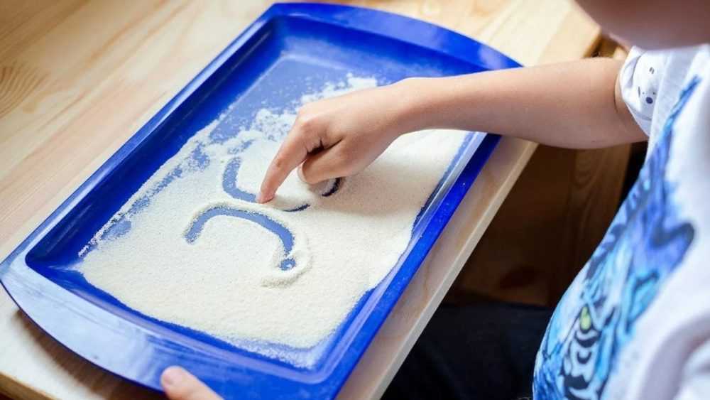 Справившись с подготовкой к рисованию, остается высыпать манку на основу, чтобы она сплошным слоем 2–4 мм покрыла поверхность, и усадить ребенка за стол.