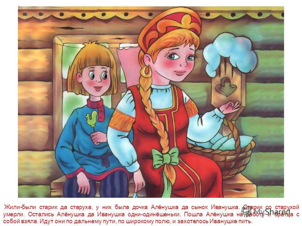 Жили-были старик да старуха, у них была дочка Алёнушка да сынок Иванушка. Старик со старухой умерли. Остались Алёнушка да Иванушка одни-одинёшеньки. Пошла Алёнушка на работу и братца с собой взяла. Идут они по дальнему пути, по широкому полю, и захотелось Иванушке пить.
