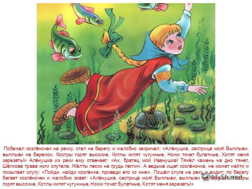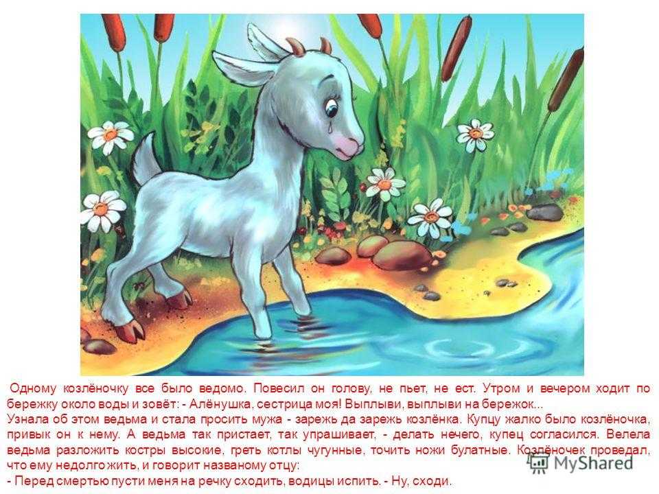 Побежал козлёночек на речку, стал на берегу и жалобно закричал: «Алёнушка, сестрица моя! Выплыви, выплыви на бережок. Костры горят высокие, Котлы кипят чугунные, Ножи точат булатные, Хотят меня зарезать!» Алёнушка из реки ему отвечает: «Ах, братец мой Иванушка! Тяжёл камень на дно тянет, Шёлкова трава ноги спутала, Жёлты пески на грудь легли». А ведьма ищет козлёночка, не может найти и посылает слугу: «Пойди, найди козлёнка, приведи его ко мне». Пошёл слуга на реку и видит: по берегу бегает козлёночек и жалобно зовет: «Алёнушка, сестрица моя! Выплыви, выплыви на бережок. Костры горят высокие, Котлы кипят чугунные, Ножи точат булатные, Хотят меня зарезать!»
