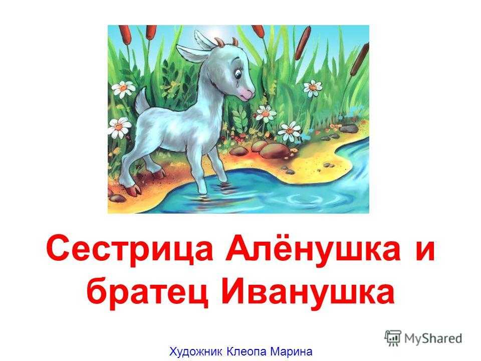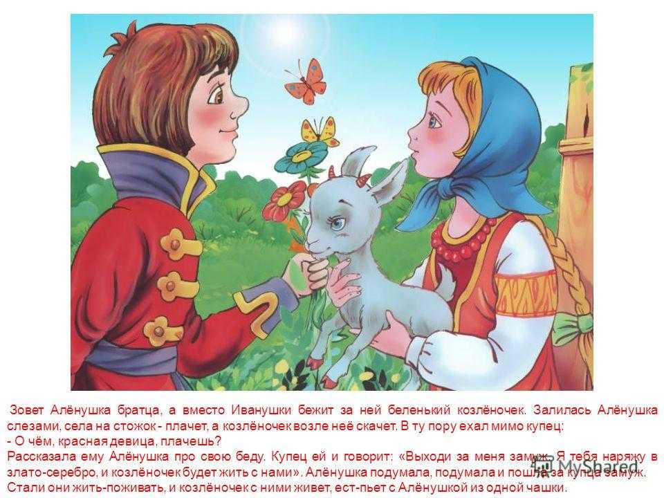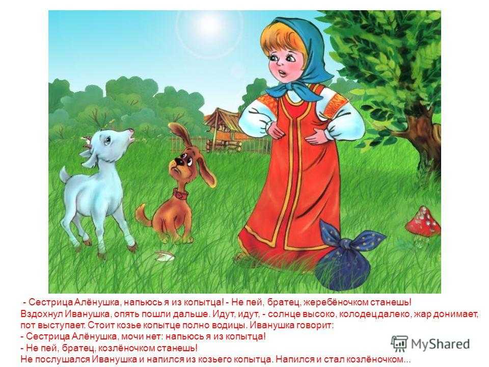 или-были старик да старуха, у них была дочка Алёнушка да сынок Иванушка.Старик со старухой умерли. Остались Алёнушка да Иванушка одни-одинешеньки.Пошла Алёнушка на работу и братца с собой взяла. Идут они по дальнему пути, по широкому полю, и захотелось Иванушке пить.– Сестрица Алёнушка, я пить хочу!– Подожди, братец, дойдем до колодца.Шли-шли, – солнце высоко, колодец далеко, жар донимает, пот выступает. Стоит коровье копытце полно водицы.– Сестрица Алёнушка, хлебну я из копытца!– Не пей, братец, телёночком станешь!Братец послушался, пошли дальше. Солнце высоко, колодец далеко, жар донимает, пот выступает. Стоит лошадиное копытце полно водицы.– Сестрица Алёнушка, напьюсь я из копытца!– Не пей, братец, жеребёночком станешь!Вздохнул Иванушка, опять пошли дальше. Идут, идут, – солнце высоко, колодец далеко, жар донимает, пот выступает. Стоит козье копытце полно водицы.Иванушка говорит:– Сестрица Алёнушка, мочи нет: напьюсь я из копытца!– Не пей, братец, козлёночком станешь!Не послушался Иванушка и напился из козьего копытца. Напился и стал козлёночком…Зовет Алёнушка братца, а вместо Иванушки бежит за ней беленький козлёночек.