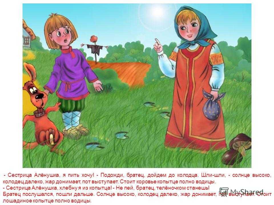 — Сестрица Алёнушка, я пить хочу! — Подожди, братец, дойдем до колодца. Шли-шли, — солнце высоко, колодец далеко, жар донимает, пот выступает. Стоит коровье копытце полно водицы. — Сестрица Алёнушка, хлебну я из копытца! — Не пей, братец, телёночком станешь! Братец послушался, пошли дальше. Солнце высоко, колодец далеко, жар донимает, пот выступает. Стоит лошадиное копытце полно водицы.