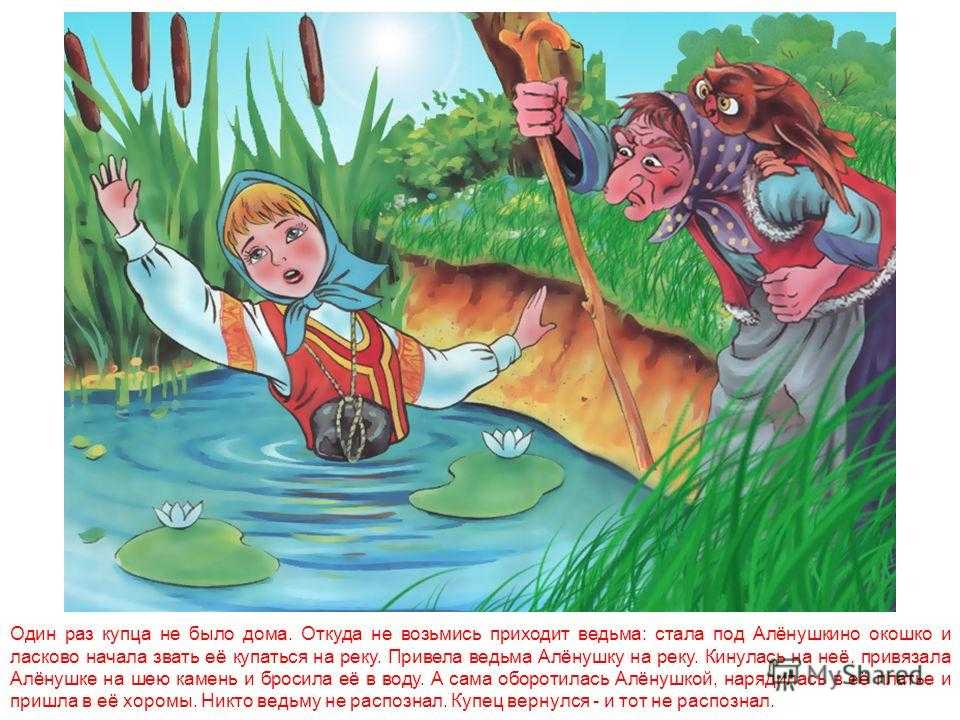 Один раз купца не было дома. Откуда не возьмись приходит ведьма: стала под Алёнушкино окошко и ласково начала звать её купаться на реку. Привела ведьма Алёнушку на реку. Кинулась на неё, привязала Алёнушке на шею камень и бросила её в воду. А сама оборотилась Алёнушкой, нарядилась в её платье и пришла в её хоромы. Никто ведьму не распознал. Купец вернулся — и тот не распознал.