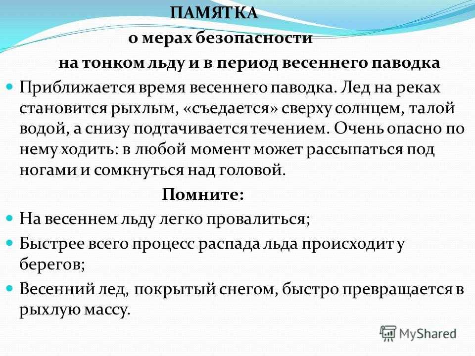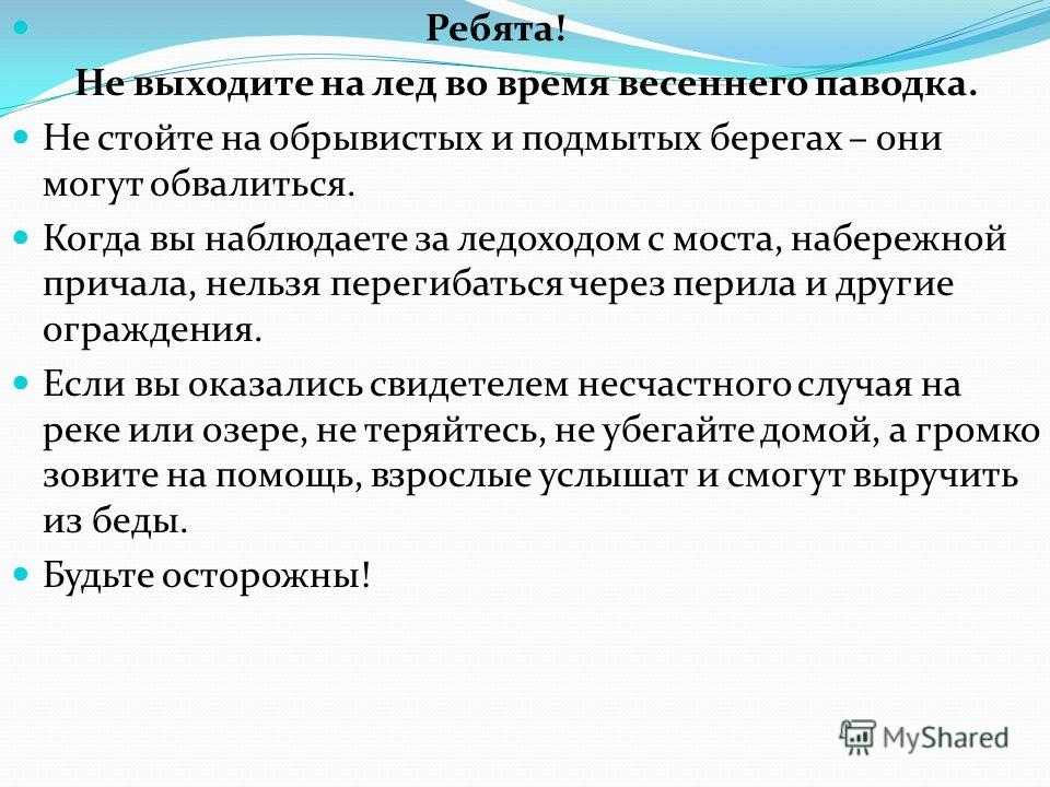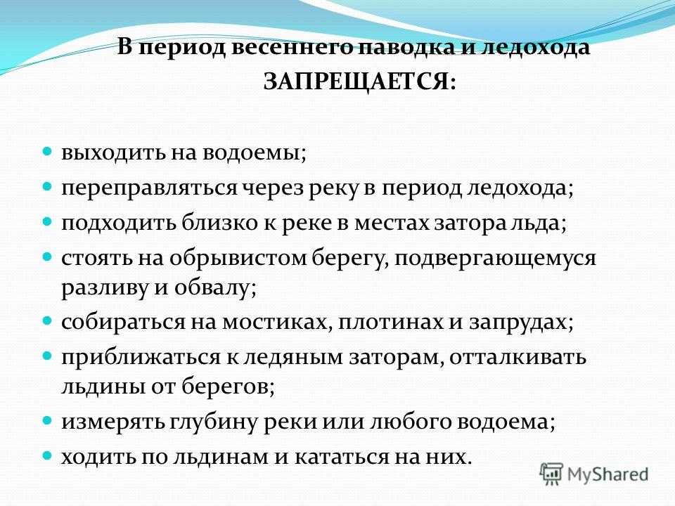 В период весеннего паводка и ледохода ЗАПРЕЩАЕТСЯ: выходить на водоемы; переправляться через реку в период ледохода; подходить близко к реке в местах затора льда; стоять на обрывистом берегу, подвергающемуся разливу и обвалу; собираться на мостиках, плотинах и запрудах; приближаться к ледяным заторам, отталкивать льдины от берегов; измерять глубину реки или любого водоема; ходить по льдинам и кататься на них. БУДЬТЕ ВНИМАТЕЛЬНЫ И ОСТОРОЖНЫ! ЛЕД ВЕСНОЙ ОПАСЕН!