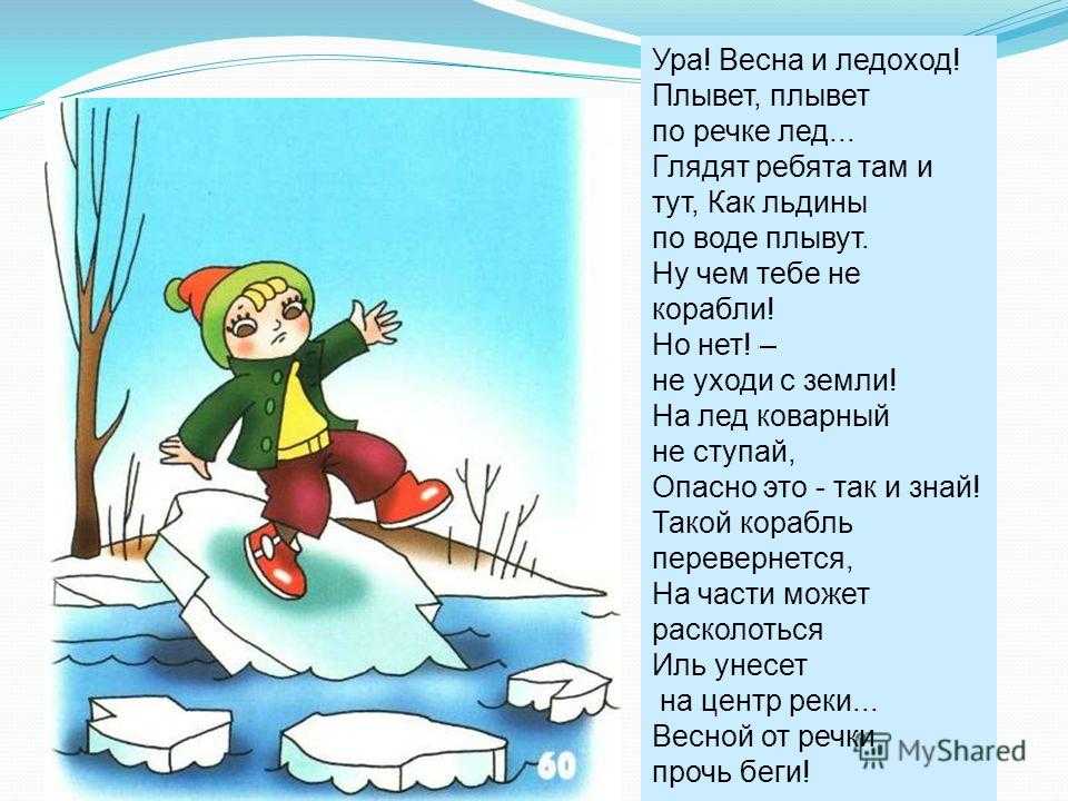 Ура! Весна и ледоход! Плывет, плывет по речке лед… Глядят ребята там и тут, Как льдины по воде плывут. Ну чем тебе не корабли! Но нет! – не уходи с земли! На лед коварный не ступай, Опасно это — так и знай! Такой корабль перевернется, На части может расколоться Иль унесет на центр реки… Весной от речки прочь беги!
