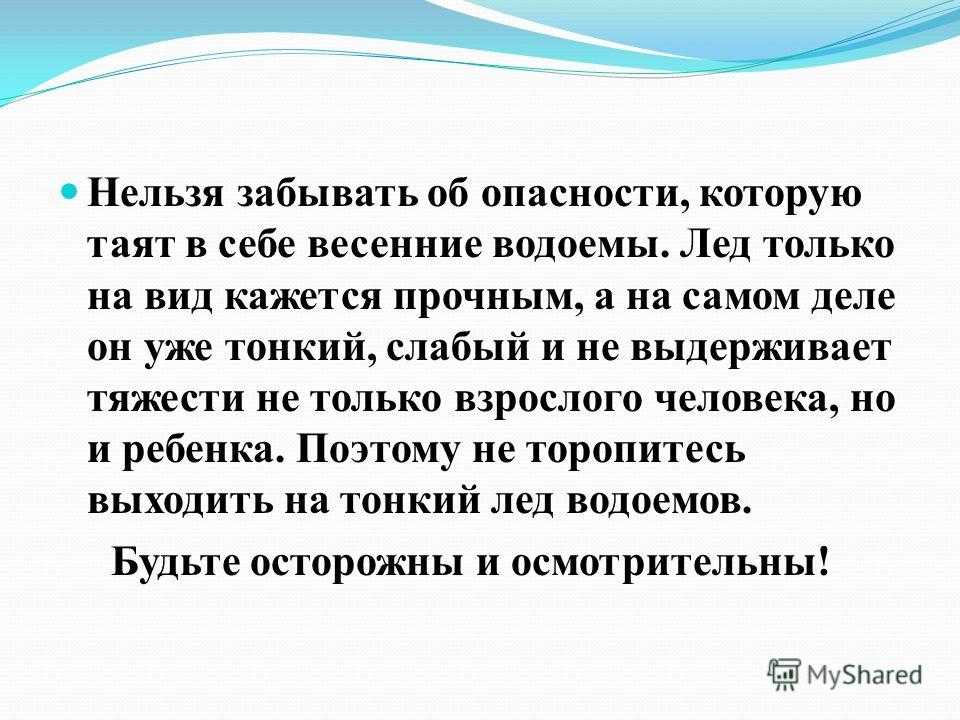 Нельзя забывать об опасности, которую таят в себе весенние водоемы. Лед только на вид кажется прочным, а на самом деле он уже тонкий, слабый и не выдерживает тяжести не только взрослого человека, но и ребенка. Поэтому не торопитесь выходить на тонкий лед водоемов. Будьте осторожны и осмотрительны!