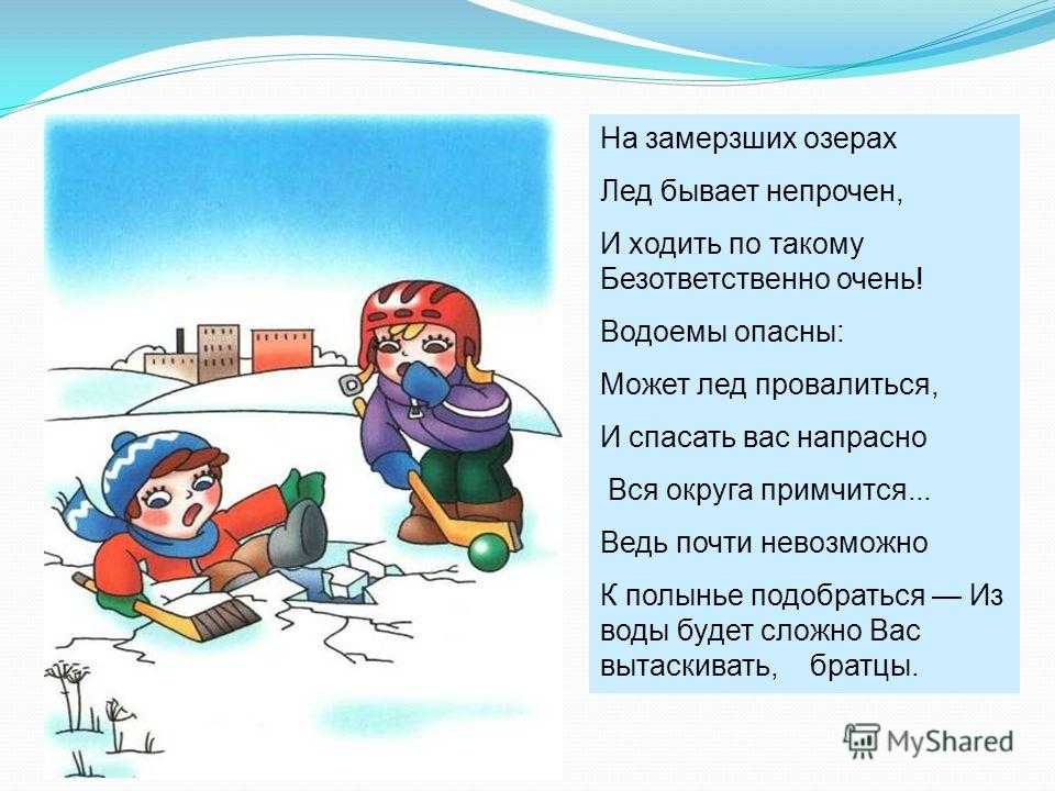 На замерзших озерах Лед бывает непрочен, И ходить по такому Безответственно очень! Водоемы опасны: Может лед провалиться, И спасать вас напрасно Вся округа примчится… Ведь почти невозможно К полынье подобраться Из воды будет сложно Вас вытаскивать, братцы.
