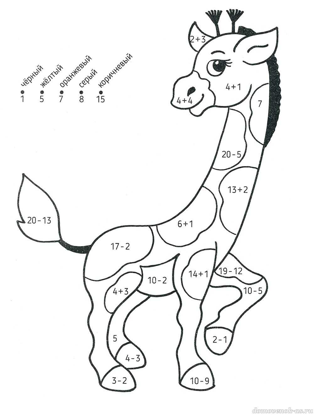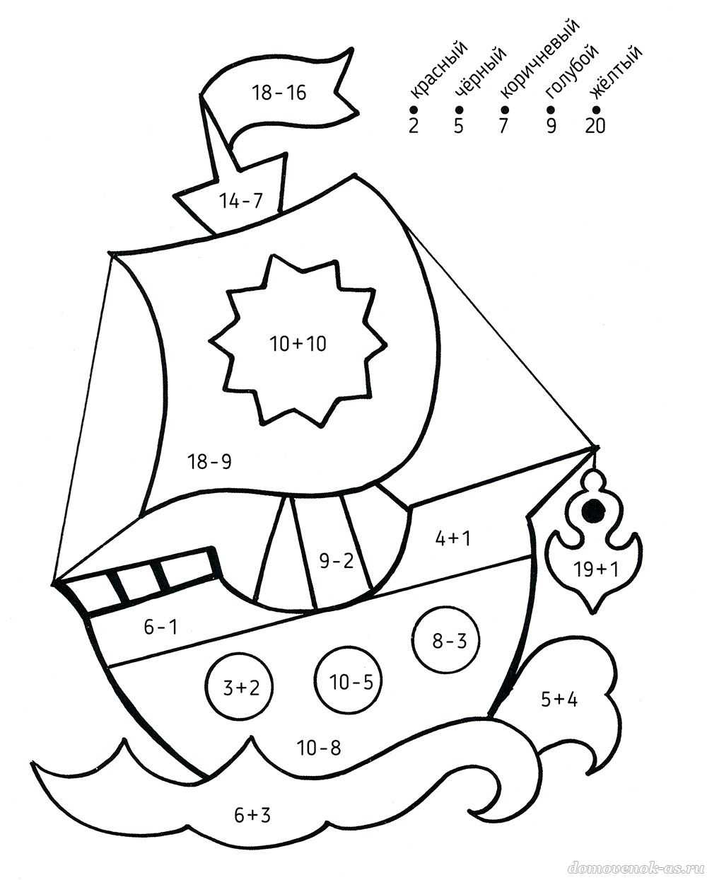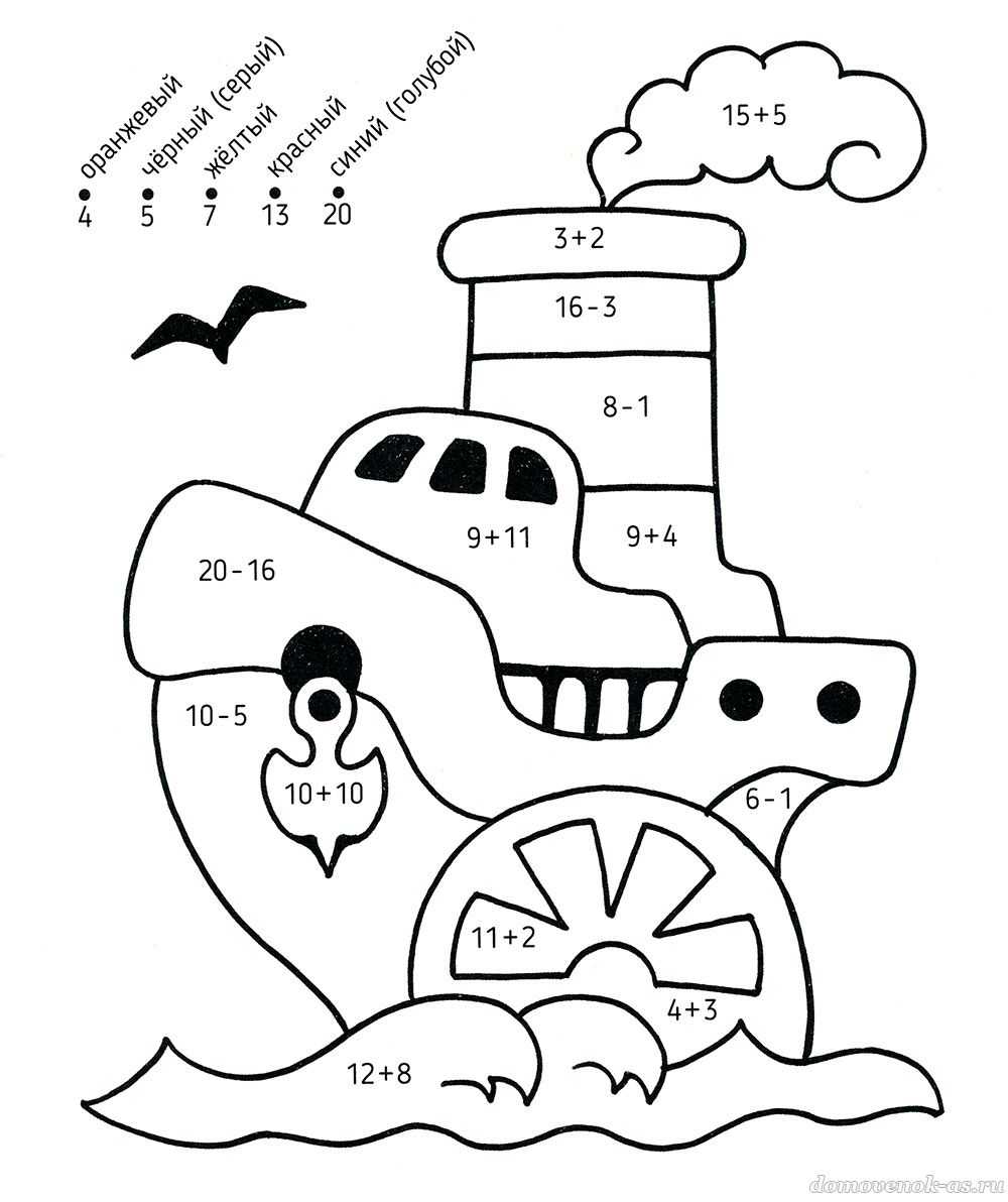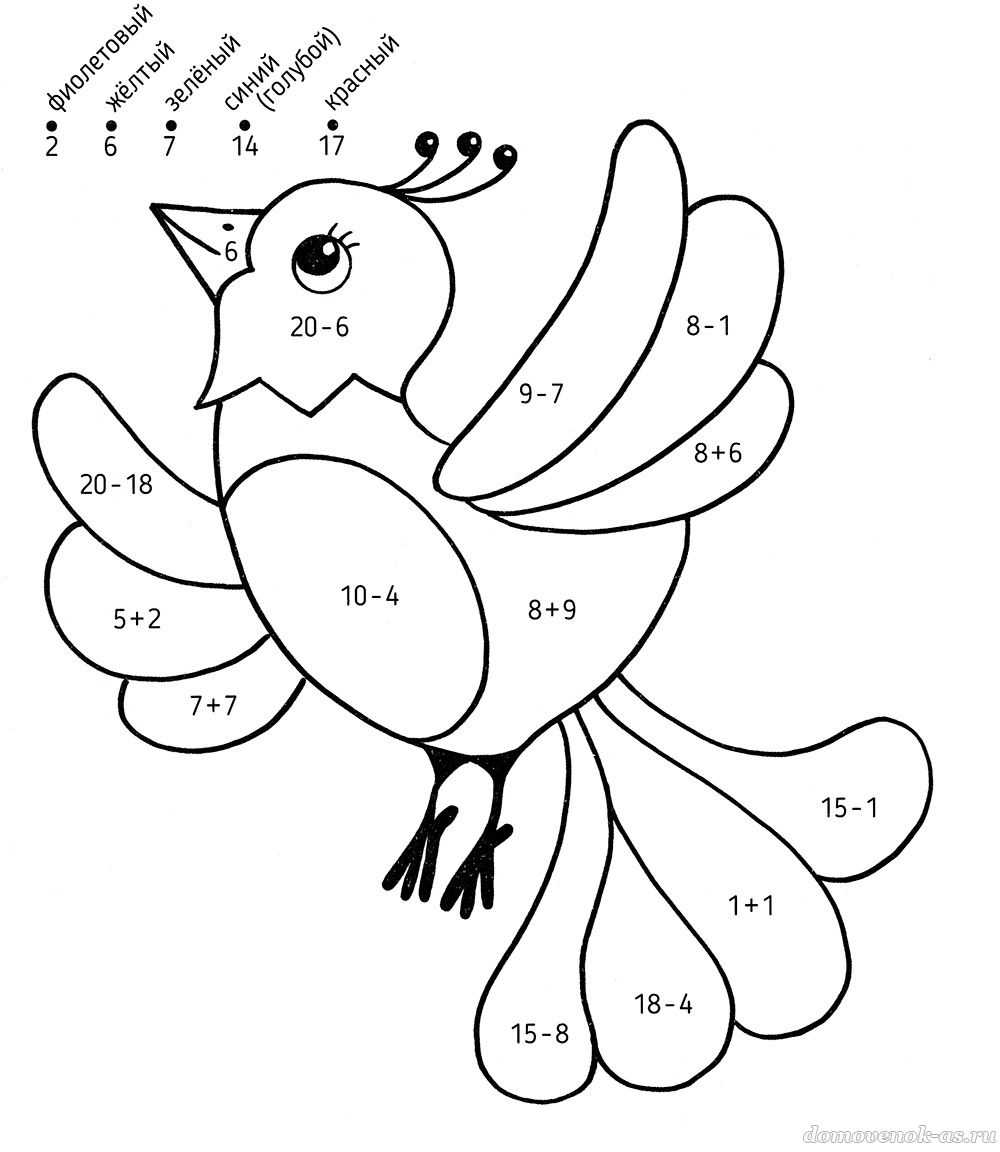 Реши примеры и раскрась детали в соответствующие ответам цвета.