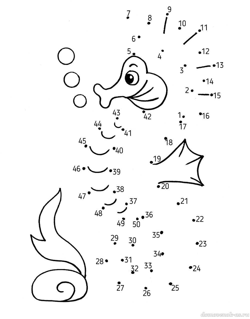 №3. Морские коньки – удивительные обитатели морей и океанов. Их чешуйки могут сливаться с окружающей средой. Обведи морского конька по точкам, следуя за цифрами.