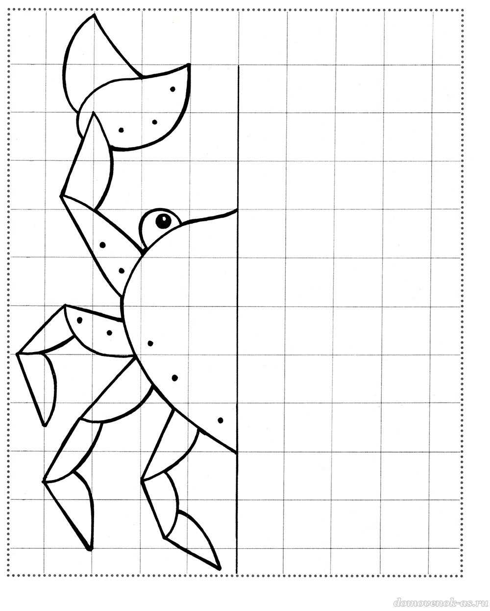 №5. Сколько ножек у забавного краба? Целых шесть! Дорисуй по клеткам и раскрась морского обитателя.