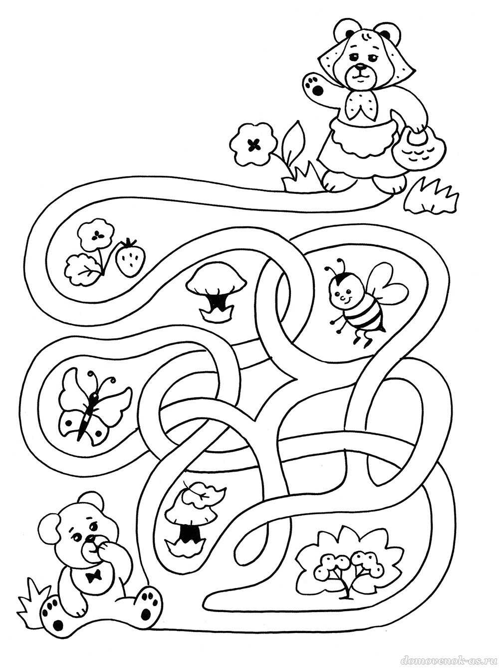 Пройди через лабиринт, помоги медвежонку скорее найти маму-медведицу и раскрась картинку!