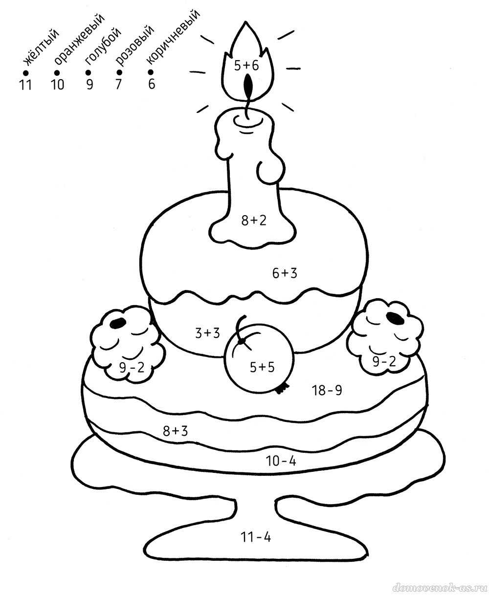 Правильно реши примеры – и узнаешь, в какие цвета нужно раскрасить чудесное угощение.