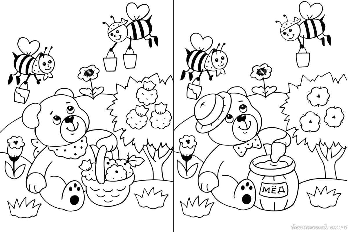 Найди на рисунках отличия, узнай, что мишка припас на обед, и раскрась лесную полянку в разные цвета.