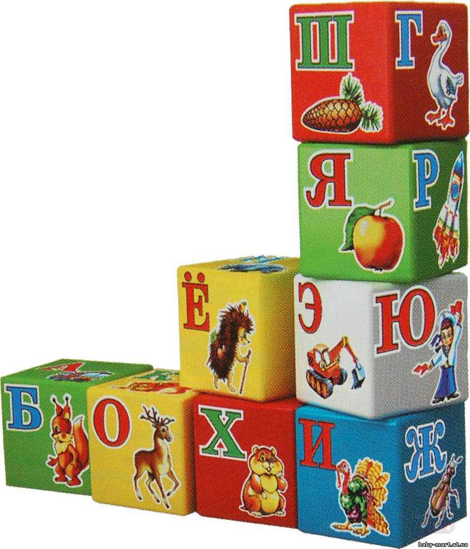 - Купите кубики с буквами и изображениями на каждую букву. Кубики могут быть мягкие, пластмассовые, деревянные