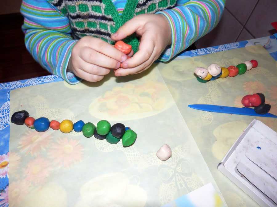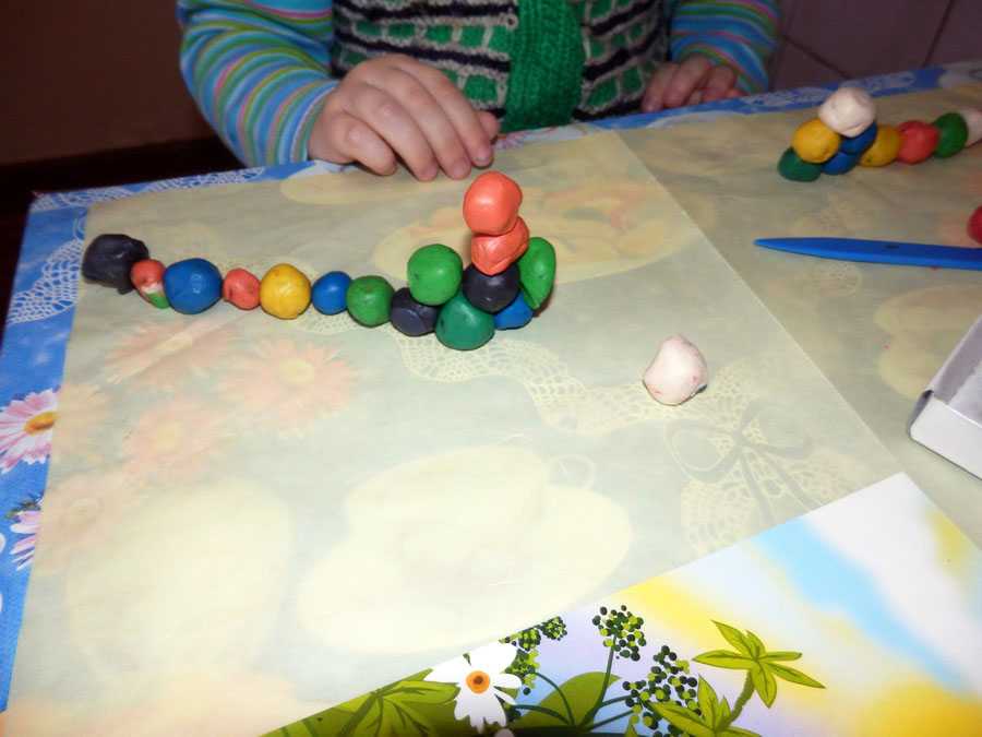 Задача взрослого: накатать как можно больше разноцветных пластилиновых шариков. Ребенок из этих шариков легко и просто сможет соорудить хоть машину, хоть снеговика. И самую длинную гусеницу на свете! Сам.
