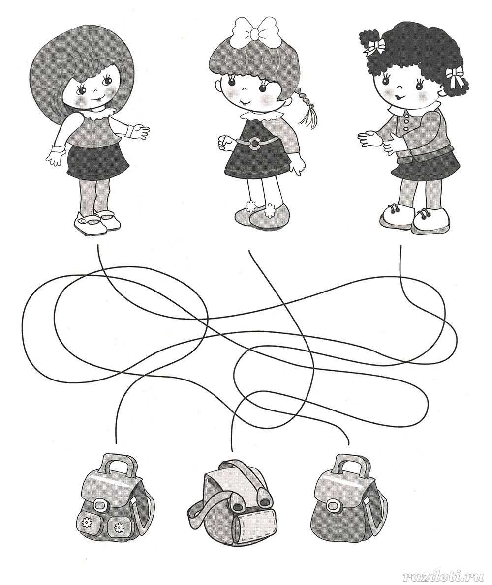 №7. Отследи глазками линии и ответь на вопрос: кому из девочек какой портфель принадлежит.