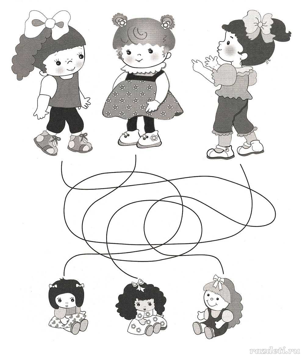 №11. Отследи глазками линии и ответь на вопрос: кому из подружек какая кукла принадлежит.