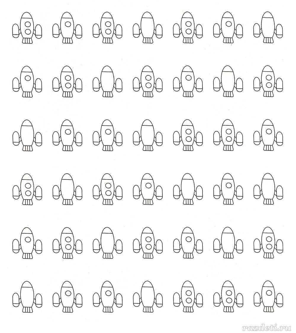 №9. Зачеркни все ракеты с двумя иллюминаторами и обведи ракеты с одним. Постарайся выполнить задание как можно быстрее.