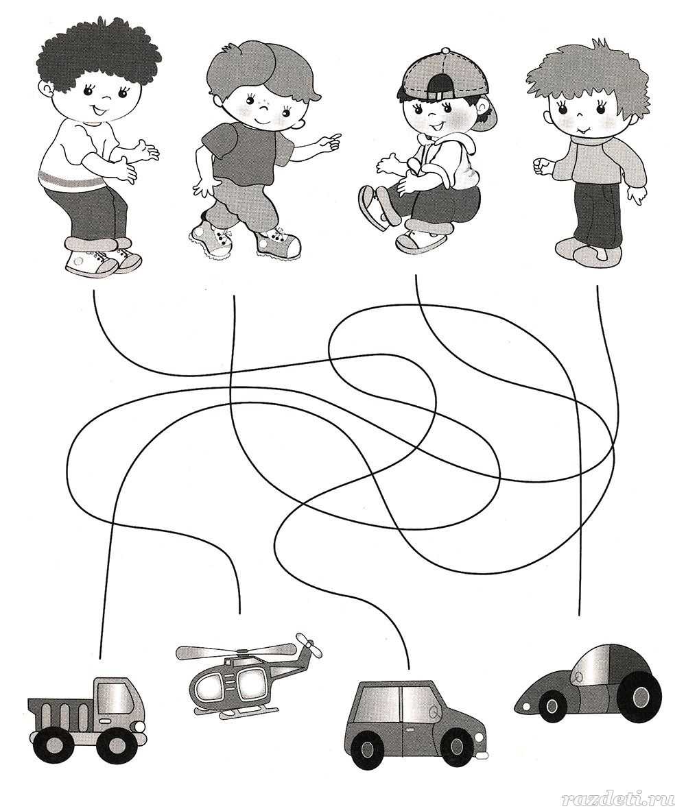 №16. Отследи глазками линии и ответь на вопрос: кому из мальчиков какая игрушка принадлежит.