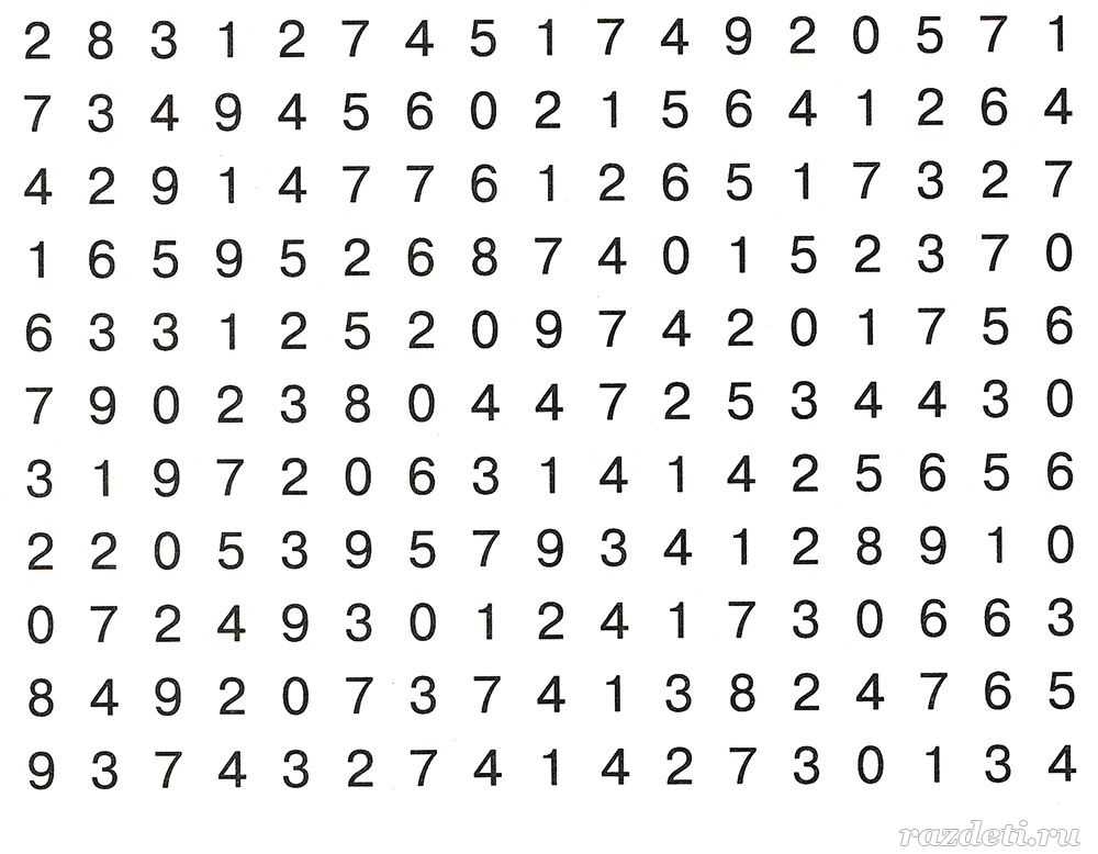 Подобное задание для развития внимательности, только теперь числа расположены не в таблице, а вразброс и имеют различную величину, цвет и форму. Желательно справиться с таким задание за 4 минуты.