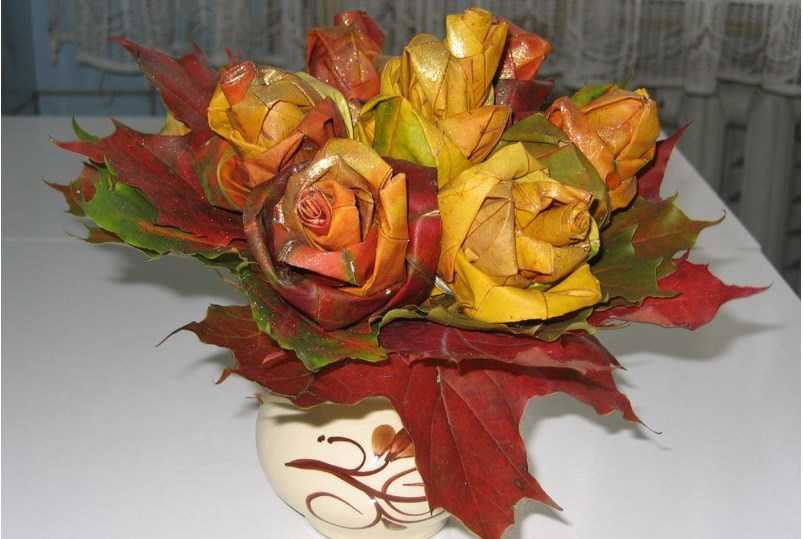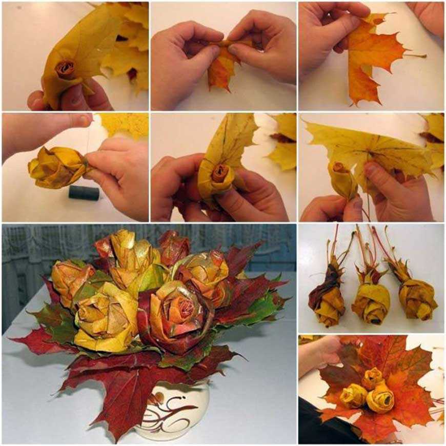 Это конечно же букеты из листьев, делаются довольно просто, а смотрятся шикарно и оригинально. Немного фантазий и ваша работа не будет похожа на других. На фото ниже вы можете посмотреть как поэтапно выполнить такую работу.