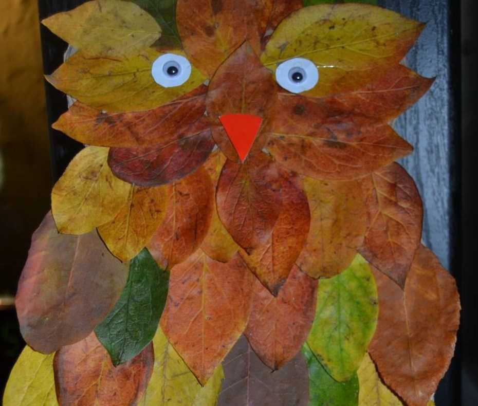 Помимо этого можно сделать осеннюю сову. Сначала берется прочный картон, на котором изображают силуэт птицы и вырезают его. Приготовить отдельно глазки, лапки и клюв. Начиная с нижнего края, на контур совы приклеивают сухие листочки, чередуя их цвет. Когда нижняя часть будет готова, можно приклеивать лапки. Полностью доклеив листья, нужно прикрепить желтые глаза, дорисовав на них черные кружочки, и уши совы. Остается только приклеить клювик посредине композиции. Такая поделка отлично впишется в интерьер дома или придется по душе малышу в детском садике.