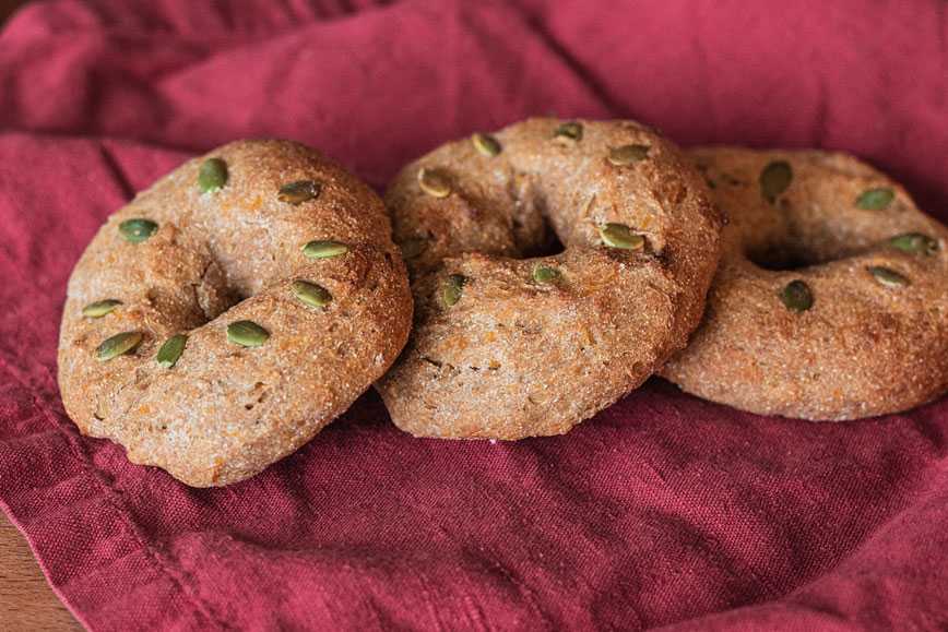 Бублики получились ароматные, влажные и очень вкусные! Результат зависит от тыквы. Чем она слаще, тем лучше получатся бейглы. Мне нравится есть их тёплыми, намазав сливочным маслом.